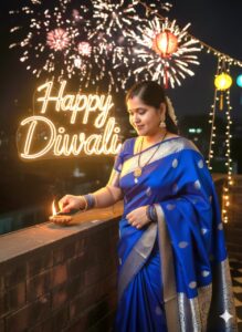 Add a soft, warm light setup highlighting the face and outfit — the lighting should create a cinematic Diwali feel with gentle shadows and glow. The background should also include a blurred “Happy Diwali” text in warm neon light, subtly visible to add depth and celebration mood without overpowering the subject.